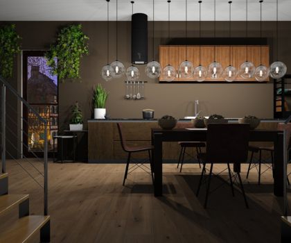 A kitchen designed with a warm wooden theme, featuring natural wood cabinetry and accents that create a cozy, rustic atmosphere.