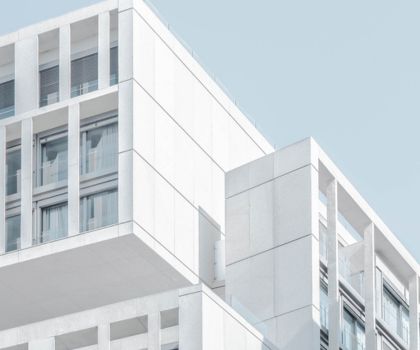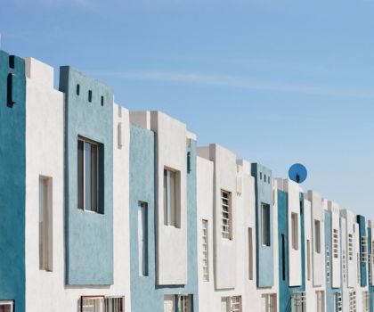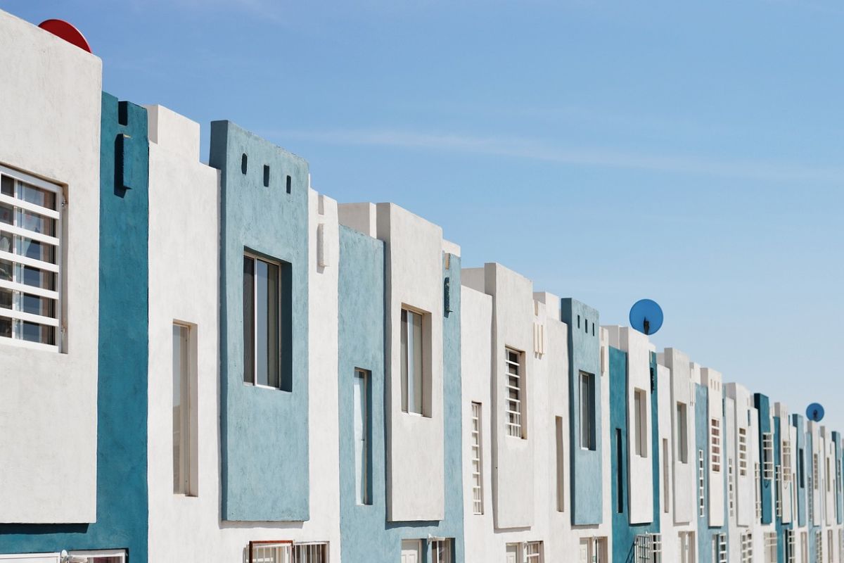 A community of joined apartments with a fresh white and sky blue color theme, offering a vibrant and modern living space that promotes comfort and tranquility.