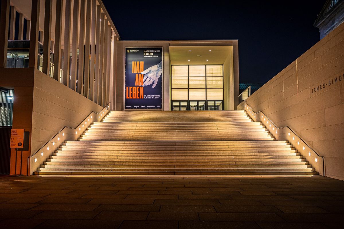 A commercial shop with a striking entrance, featuring long stairs illuminated by yellowish dim aesthetic lights along the sides, creating an inviting and stylish ambiance.